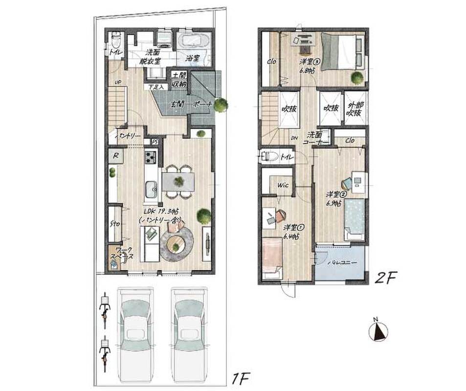 南側道路に面して2台分の並列駐車スペースを確保。戸建ならでは、1階のLDK前に駐車できるのでお荷物の運搬や小さなお子様がいらっしゃるときなどの動きも何かと便利です。