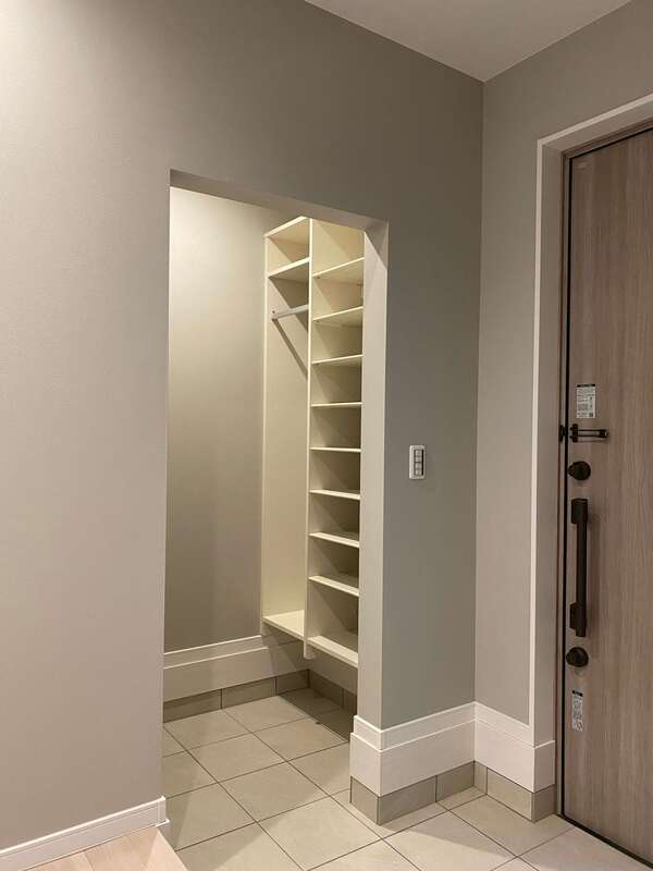 二階まで吹き抜けの玄関は明るく開放的。ベビーカーをそのまま置ける土間収納がポイントです。