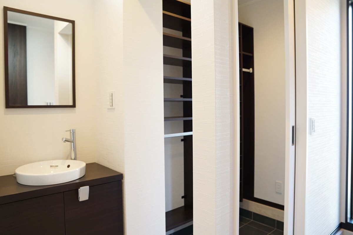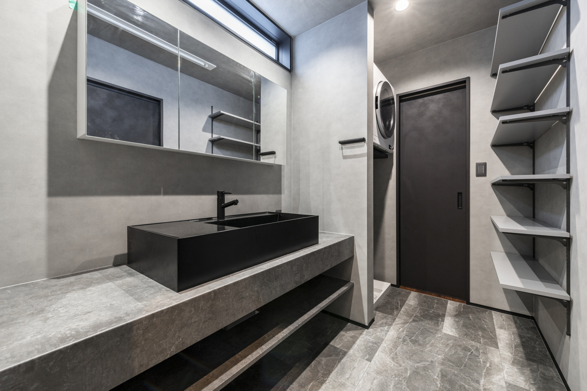 キッチンには、家族とのつながりを大切にできるペニンシュラ型対面キッチンを採用。深型食洗機を標準装備することで、家事効率とデザイン性を両立しました。さらに洗面空間には、使いやすさと美しさを兼ね備えたカスタムバニティ**を標準仕様でご提案。