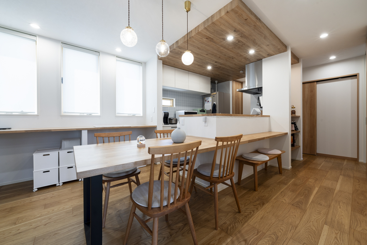家族の会話が弾む、横につながる対面キッチン施工例