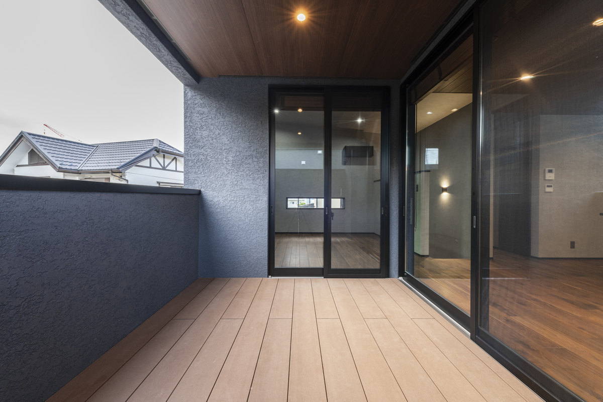 ウッドデッキ床の広々としたインナーバルコニー
