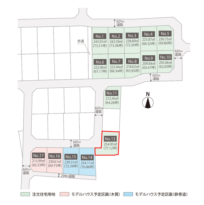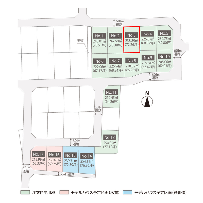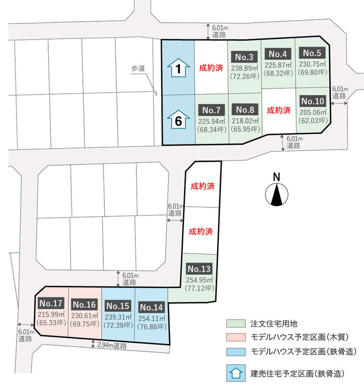 60~70坪台の敷地と、分譲地内は6m幅道路でゆとりある分譲地!