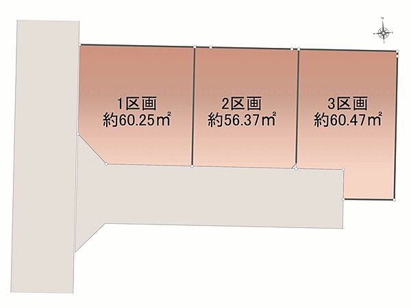 | 備考 | 建築条件無/別途共有持分0.55m2有/位置指定道路番号取得時期令和8年7月/準防火地域/通路提供部分0.06m2含(2・5区画)/建築有効面積除外部分0.05m2含(5区画のみ)/敷地内電柱有(6区画のみ)/私道部分23.32m2/管理番号:593042 | ||