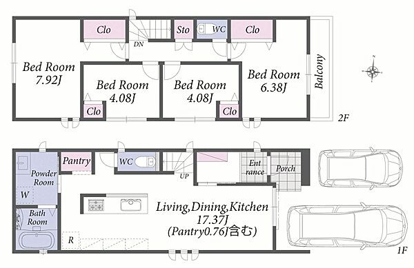 建築条件なし分譲地。カースペース付きの2階建て建物参考プランございます。