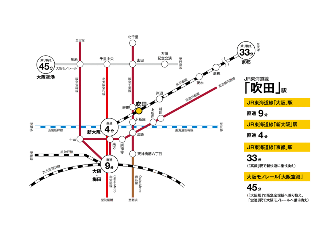 JR東海道・山陽本線「吹田」駅 徒歩6分 阪急京都本線「相川」駅 徒歩11分 阪急千里線「吹田」駅 徒歩13分 |