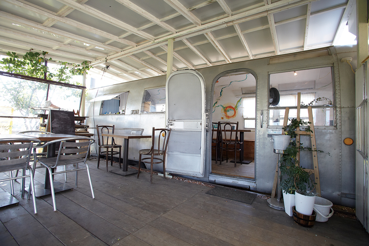 フォトスタジオとカフェの看板。 屋外スペースはハーブや花が咲き...