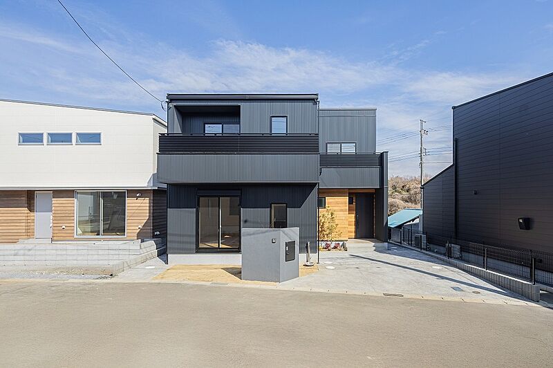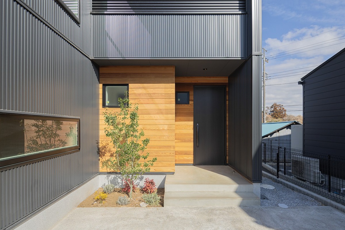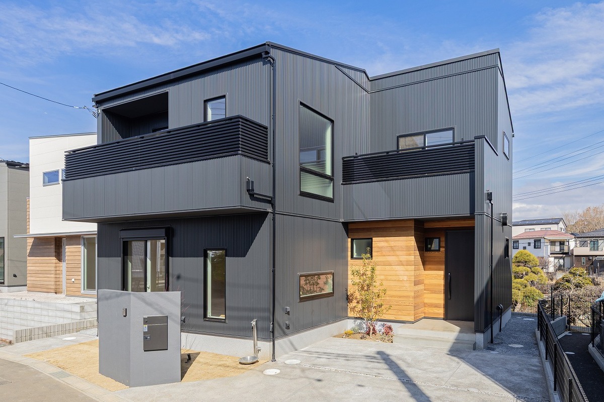 ネオブラックのガルバリウム外壁。艶感と、細いピッチの凹凸が立体...