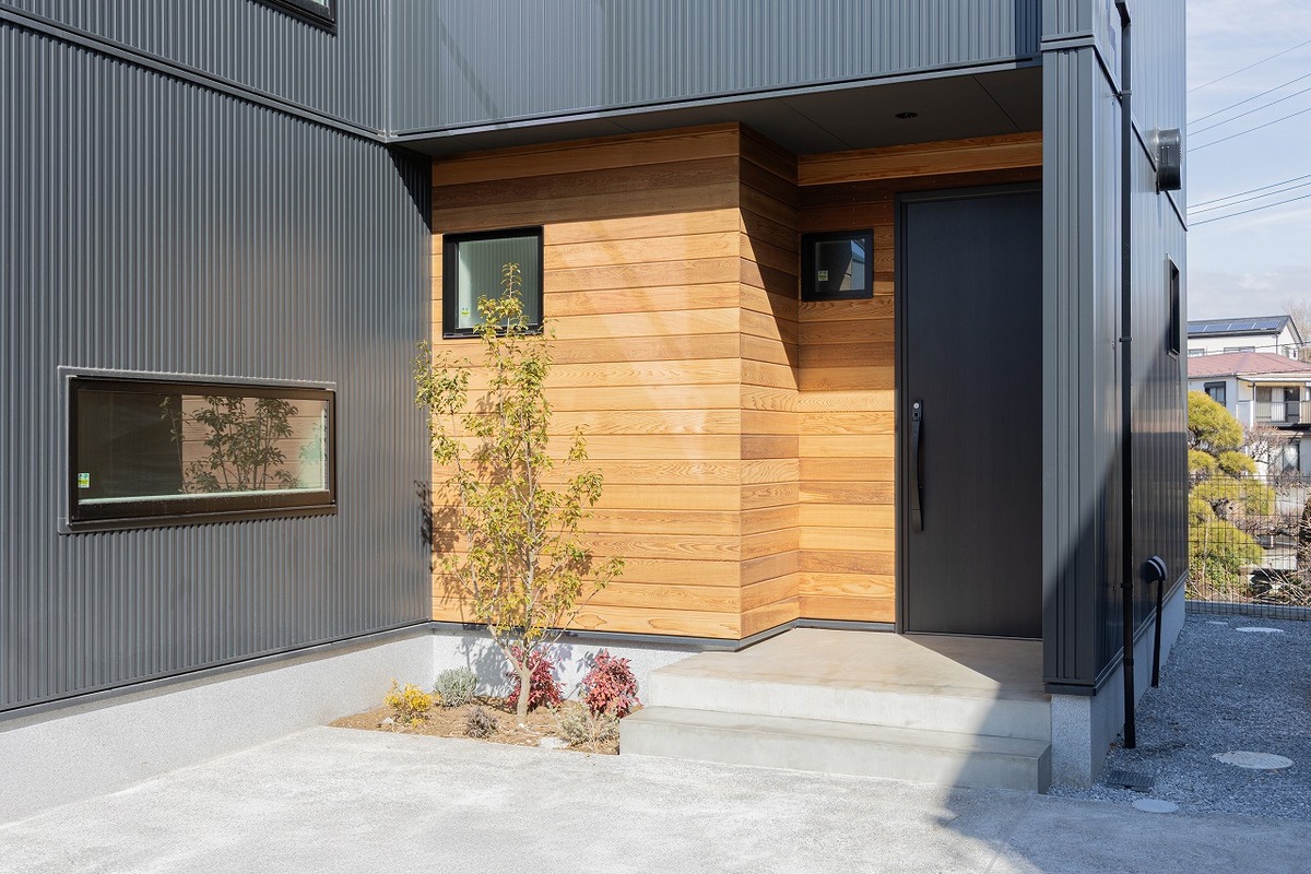ブラックにレッドシダーの木目が映え、明るい玄関を演出。