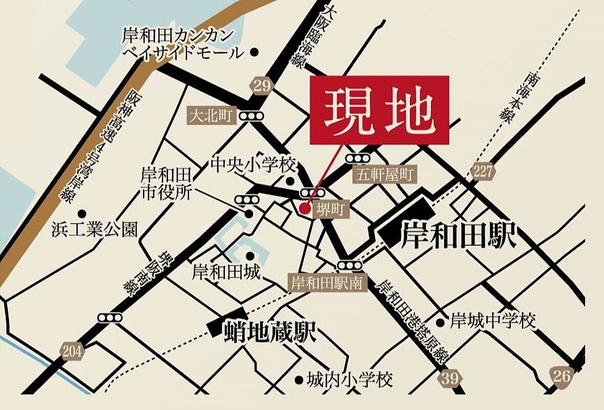南海線「岸和田」駅 徒歩8分~9分 南海線「蛸地蔵」駅 徒歩11分~12分 JR阪和線「東岸和田」駅 徒歩25分~26分 |