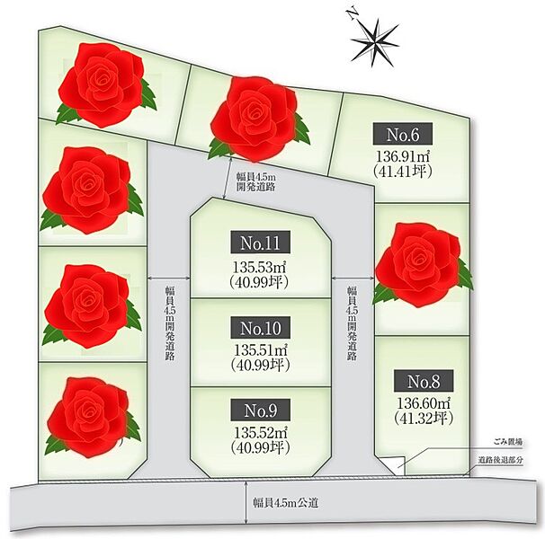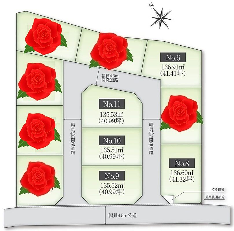 | 駐車場 | - | 道路の幅員 | 新設開発道路幅員4.5m、分譲地南西側公道幅員4~4.3m。 |