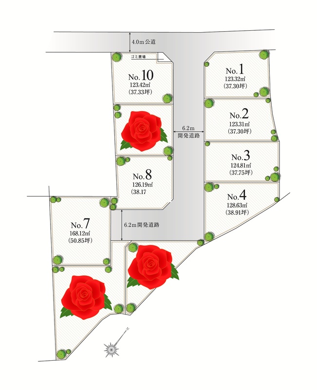 | 駐車場 | 1台 ~ 2台 | 道路の幅員 | 分譲地内6.2m開発道路、北西4m公道 |