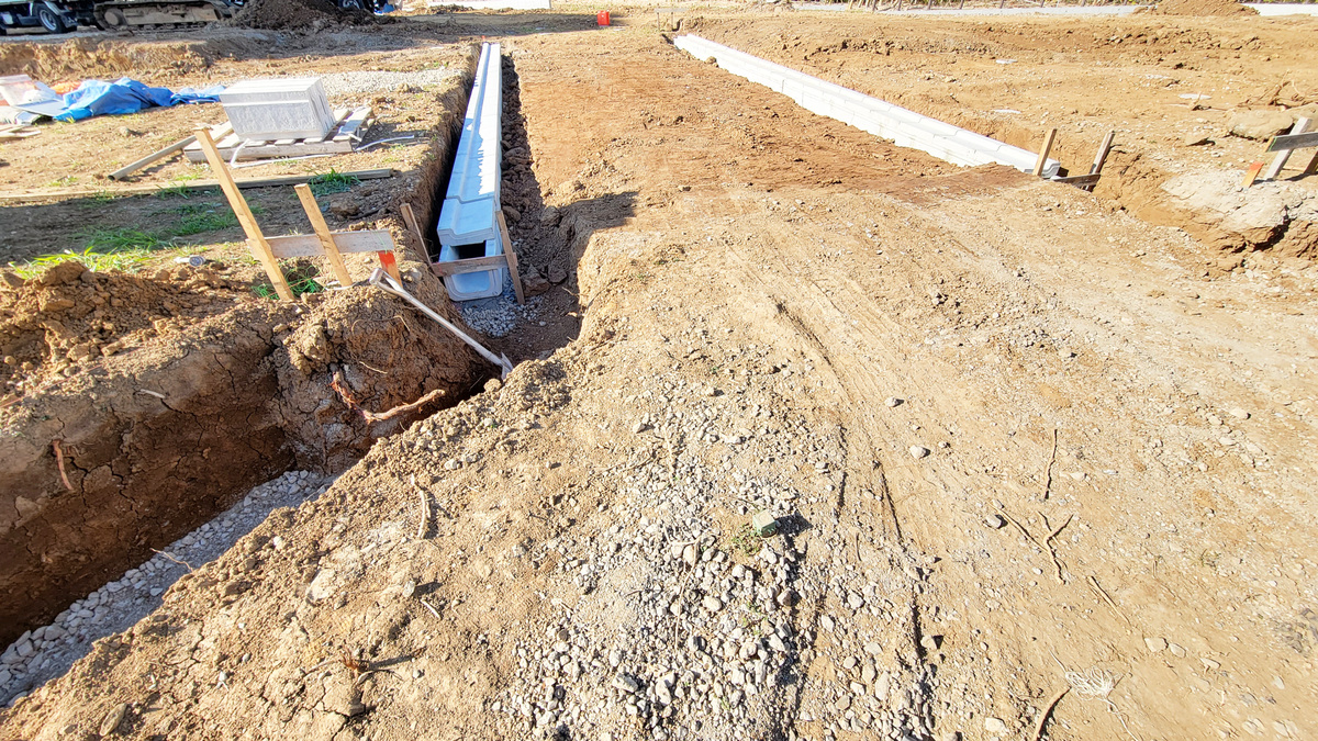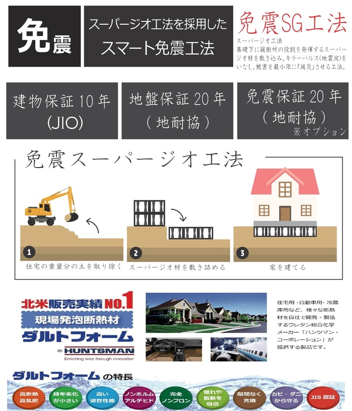 基礎下に緩衝材の役割をするスーパージオ材を敷き詰めその上に建物を建てる免震工法!安心の免震保証20年