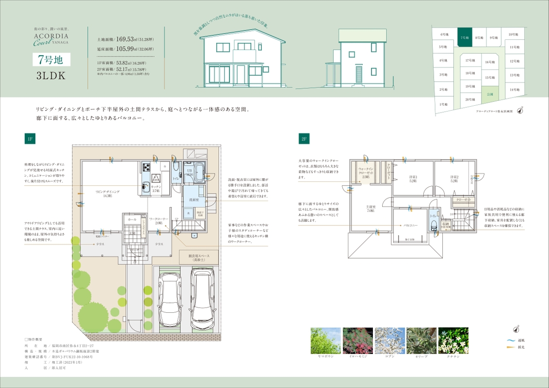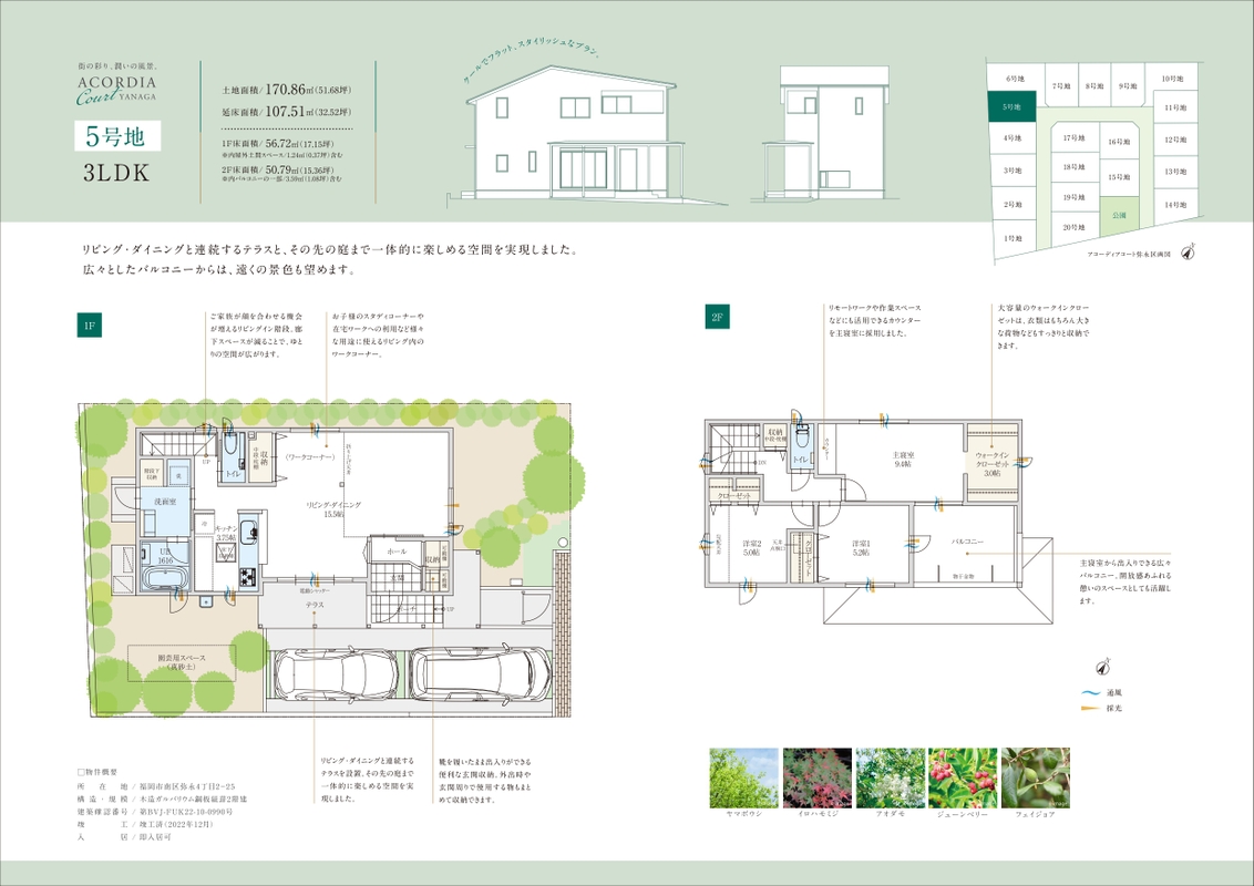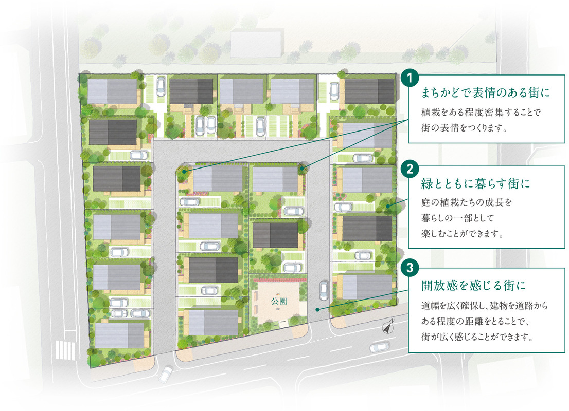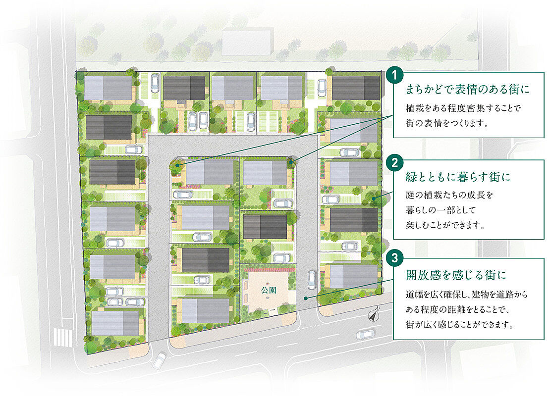 全20区画がひとつの庭のような雰囲気を成し、そこで暮らす人々の繋がりも暮らしも育むまち。家族とともにあること、自然とともにあること。地域や暮らしの調和を育む「庭」、それがアコーディアコート弥永です。