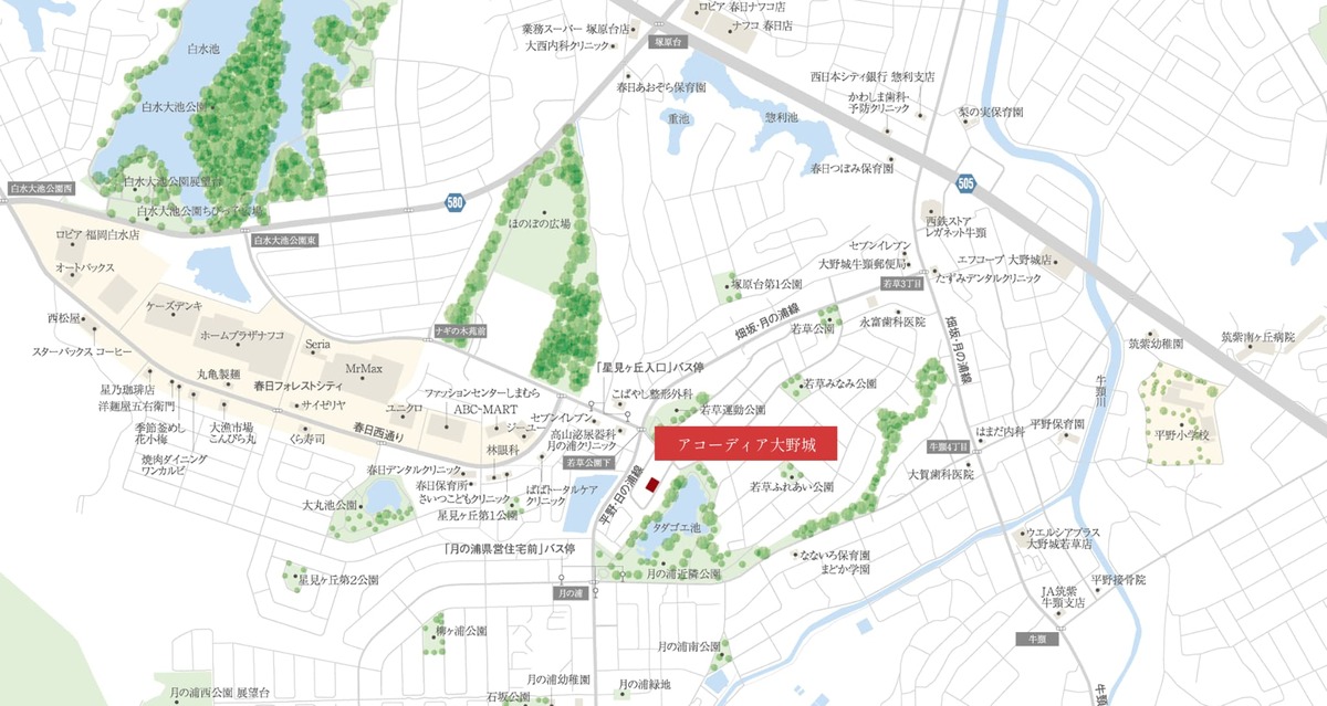 - 西鉄「月の浦県営住宅前」バス停 徒歩7分コミュニティバスやよい「星見ヶ丘入口」バス停 徒歩3分JR博多南線「博多南」駅 自転車で14分(約3.4km)