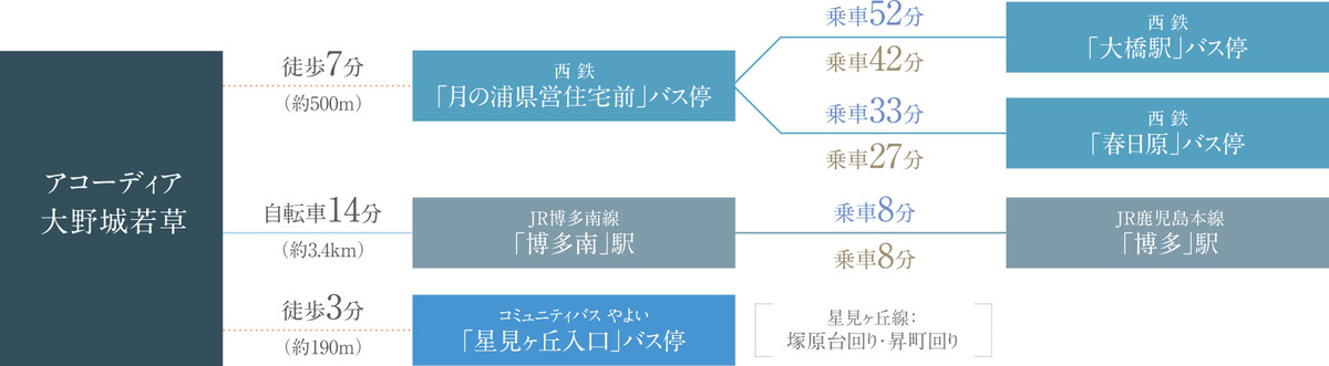 西鉄「月の浦県営住宅前」バス停 徒歩7分 コミュニティバスやよい「星見ヶ丘入口」バス停 徒歩3分 JR博多南線「博多南」駅 自転車で14分(約3.4km) |