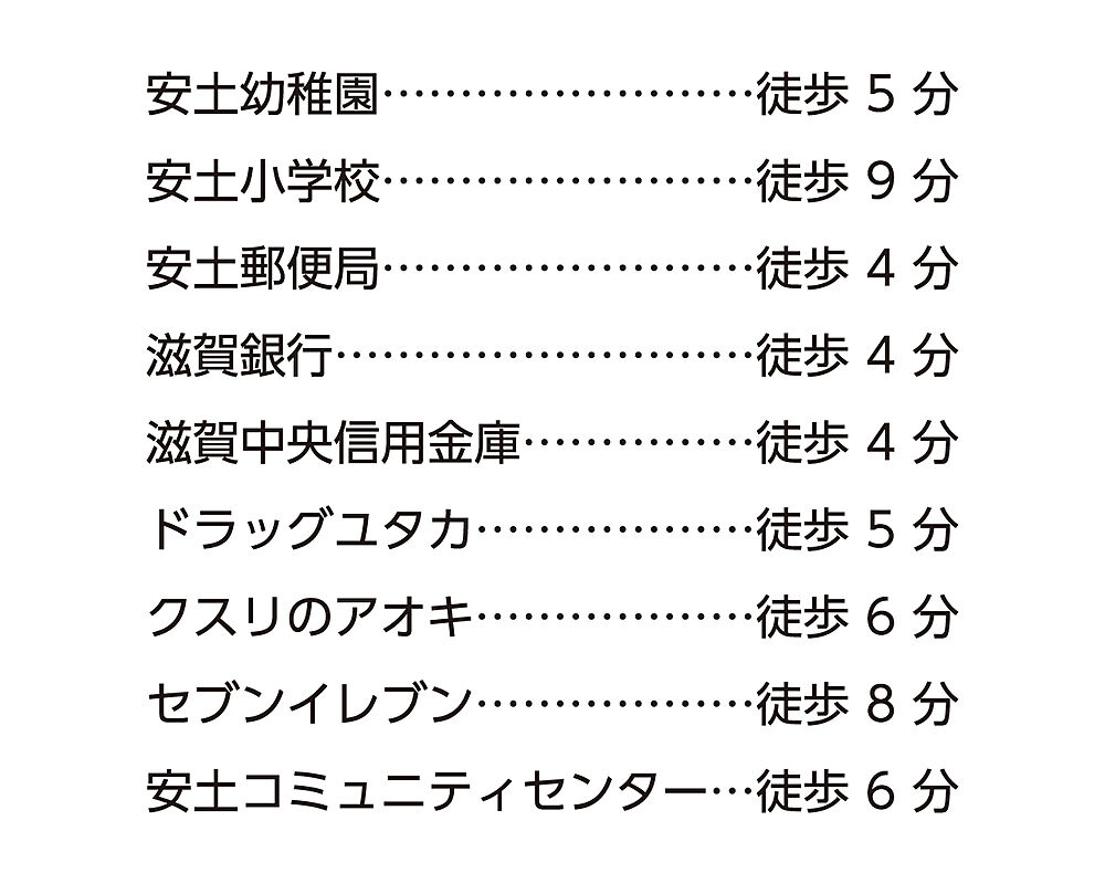 ■□JR安土駅から徒歩10分■□スーパー 、銀行、郵便局などが徒歩10分圏内に揃った好立地■□安土小学校 徒歩9分、安土幼稚園徒歩5分でお子様の通学も安心■□