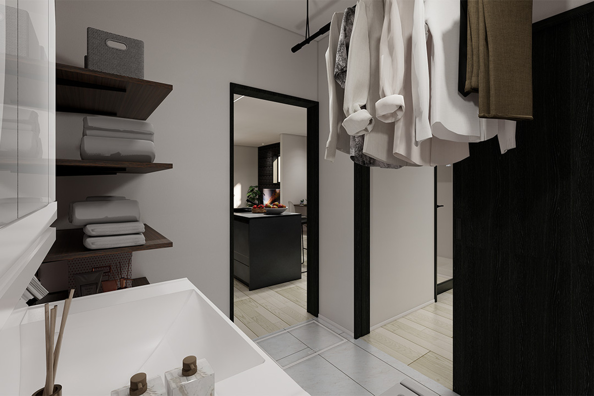 玄関からリビング、キッチンを回遊できる、家事動線を意識した水廻...