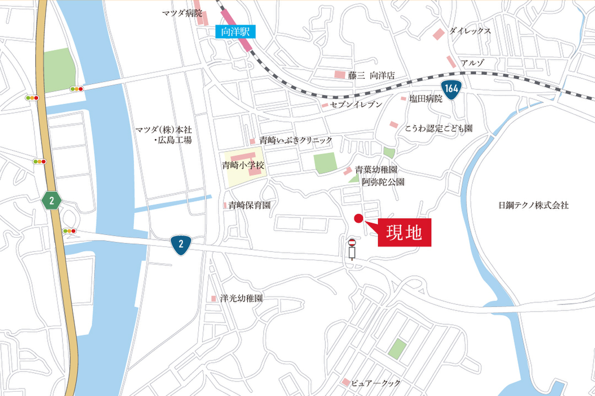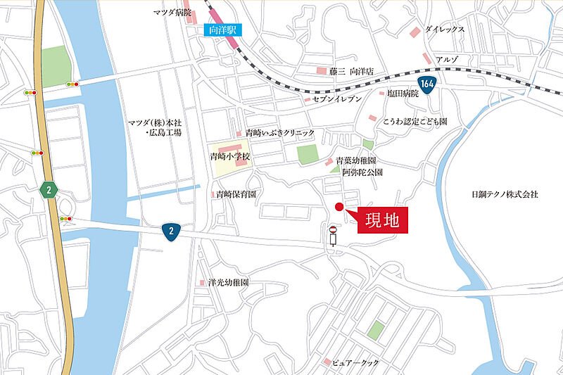 JR山陽本線「向洋」駅 徒歩14分 バス停/芸陽バス「堀越」 徒歩5分 |