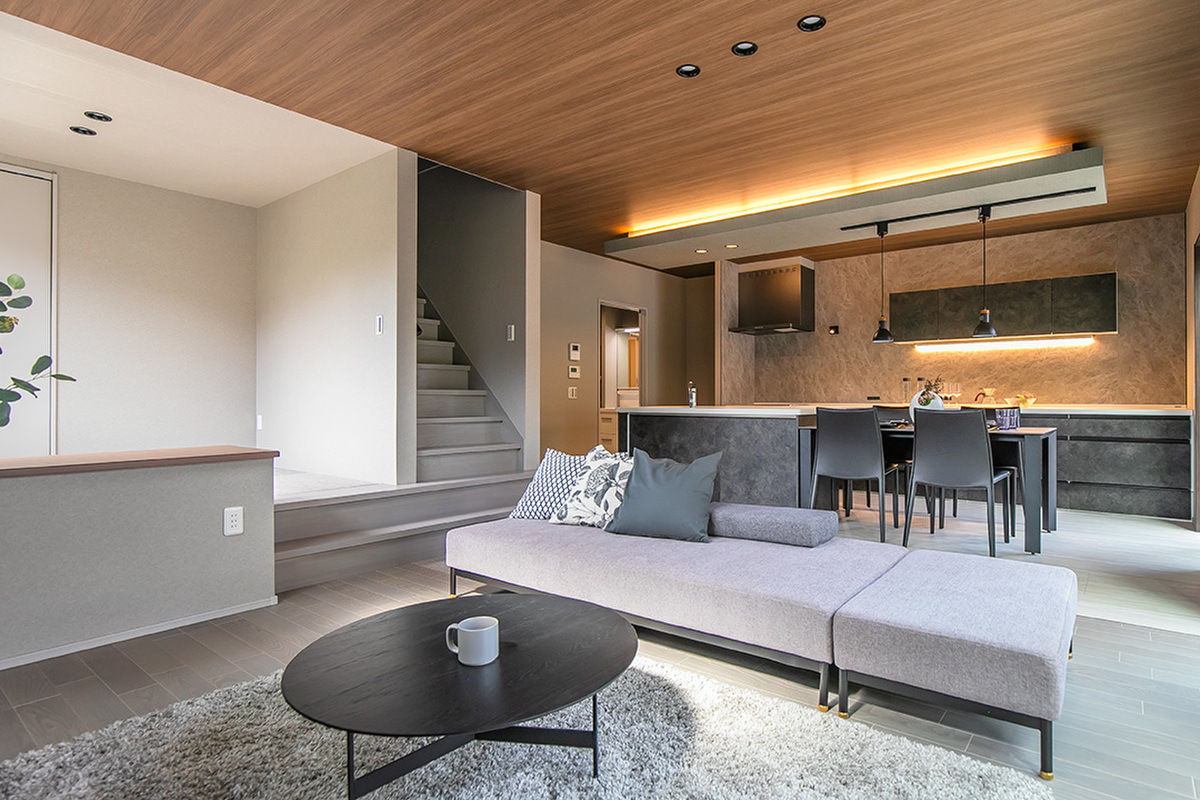折下げ天井と天井を照らすコーブ照明が広がりのある空間を演出して...