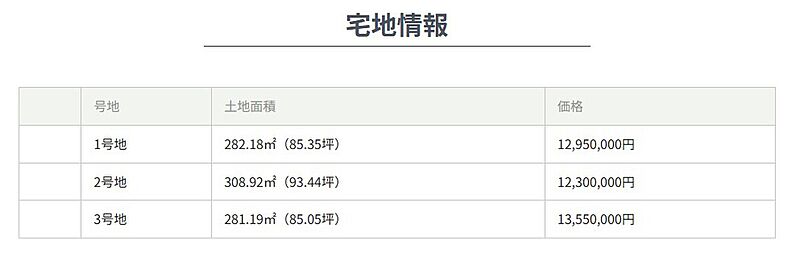 | 建物面積 | - | 土地面積 | 281.19m2~308.92m2 (土地面積・販売価格については、造成完了時に多少の誤差(実測清算)が生じる場合があります。) |