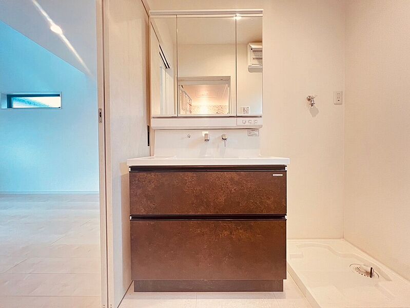 三面鏡付きの洗面化粧台は、鏡の角度を調整...