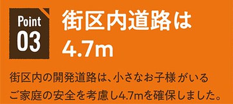 ■POINT3■街区内の開発道路は、4.7mの幅員を確保。人と車の安全な距離を考慮した道路です。小さなお子様も安心です。