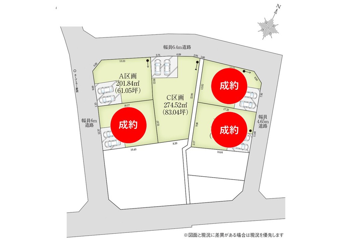 | 駐車場 | 2台 ~ 4台(1区画車2台分の土間スペース造成費込みとなっております。) | 道路の幅員 | 西側6m、北側6.4m |