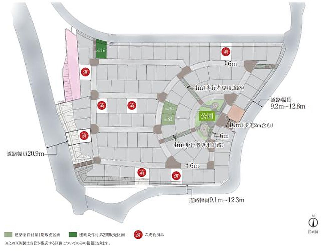 | 駐車場 | - | 道路の幅員 | 道路幅:6m/道路幅の備考:幅員 : [車道]6.0m、出入口部10.0m(8.0m(車道)2.0m(歩))、[歩行者専用道路]4.0m、舗装 : [車道]アスファルト舗装・インターロッキング舗装、[歩行者専用道路]インターロッキング舗装[外周]西側幅員20.9m、東側幅員9.2m~12.8m、南側幅員9.1m~12.3m |