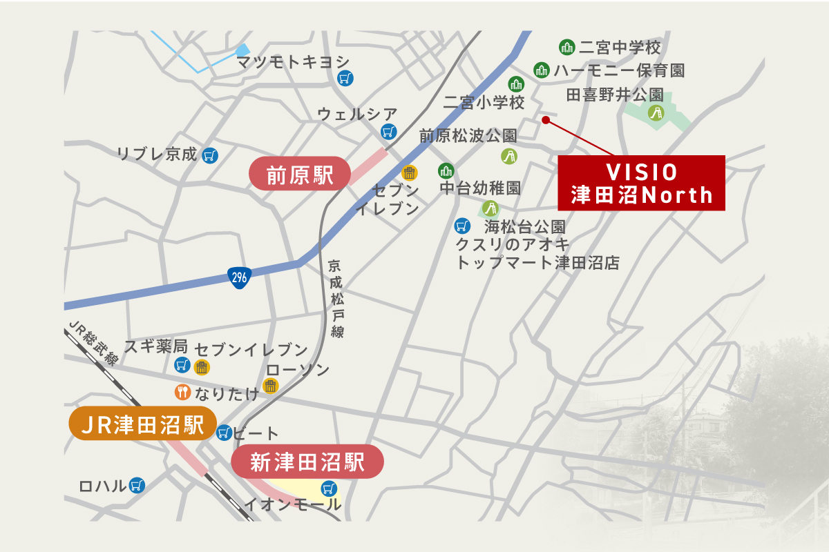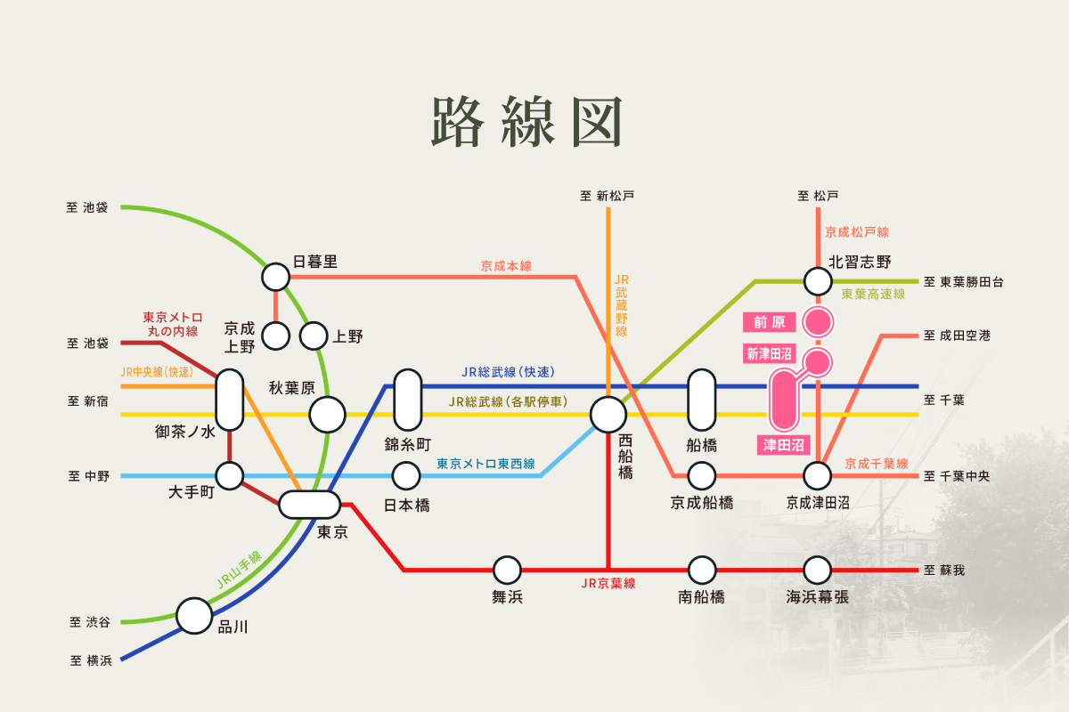 京成松戸線「前原」駅 徒歩11分 JR総武線「津田沼」駅 京成バス千葉セントラル「児童公園」バス停 約15分 徒歩3分 京成松戸線「新津田沼」駅 徒歩31分 |