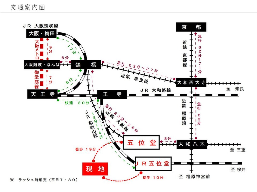 近鉄大阪線「五位堂」駅 徒歩19分~20分 JR和歌山線「JR五位堂」駅 徒歩10分~11分 |