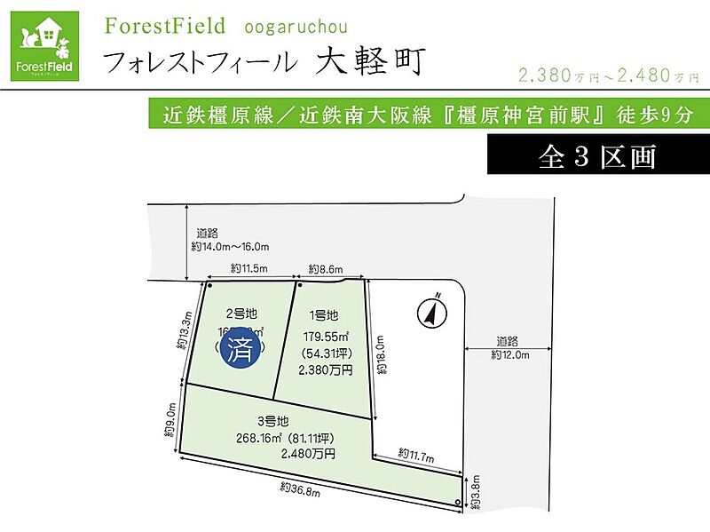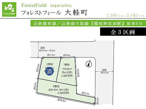 ・近鉄橿原線「橿原神宮前駅」徒歩9分・近鉄南大阪線「橿原神宮前駅」徒歩9分・小中学校徒歩10分以内・全区画土地50坪以上