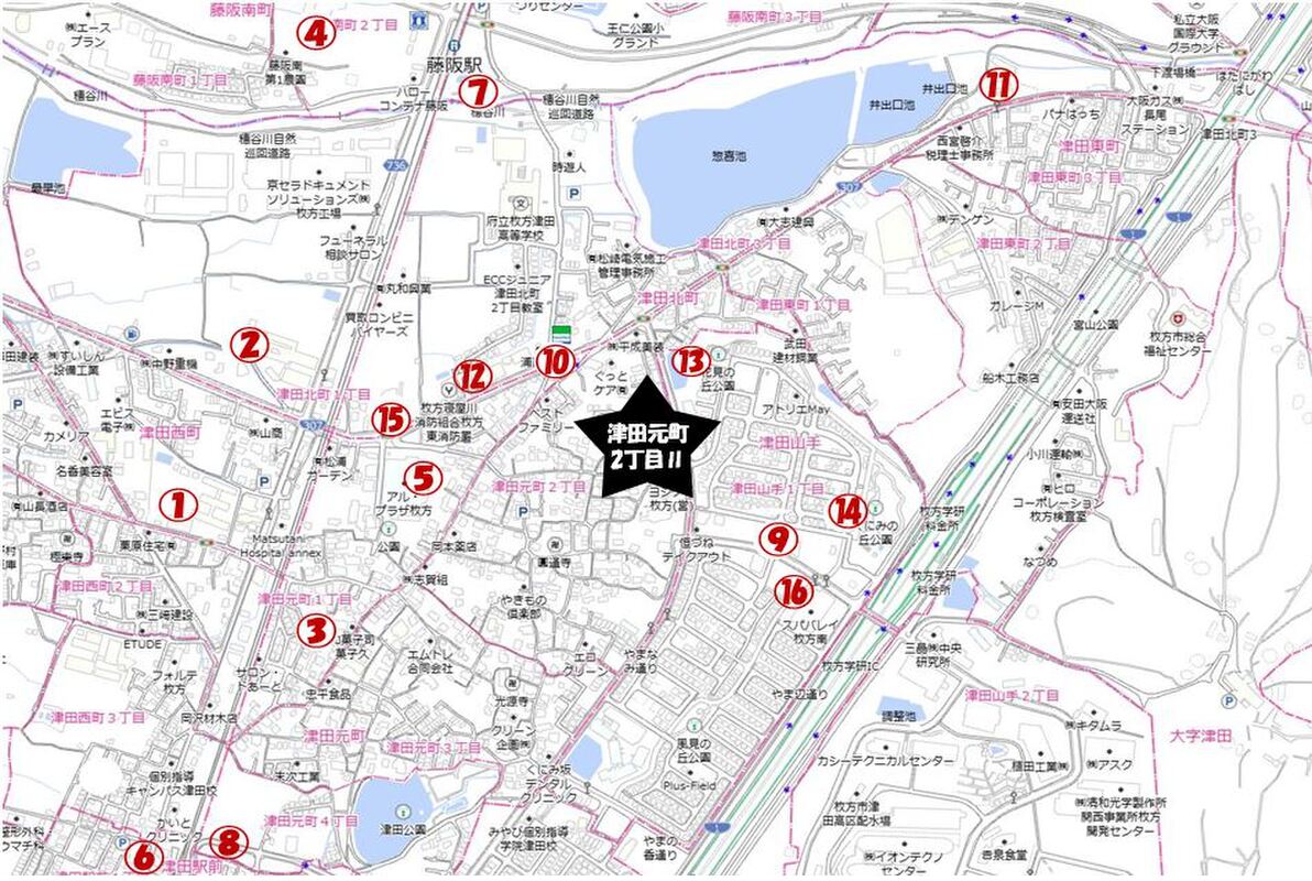 - JR片町線(学研都市線)「藤阪」駅 徒歩14分JR片町線(学研都市線)「津田」駅 徒歩18分JR片町線(学研都市線)「長尾」駅 徒歩34分