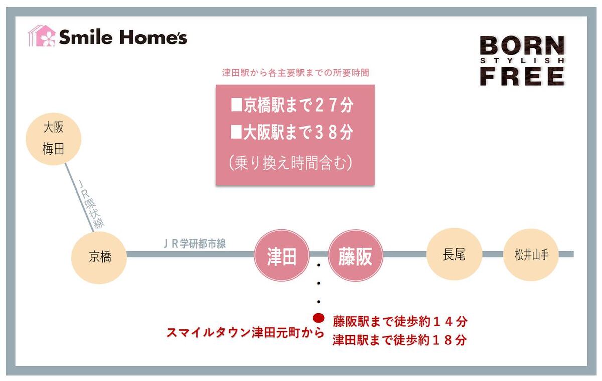 JR片町線(学研都市線)「藤阪」駅 徒歩14分 JR片町線(学研都市線)「津田」駅 徒歩18分 JR片町線(学研都市線)「長尾」駅 徒歩34分 |