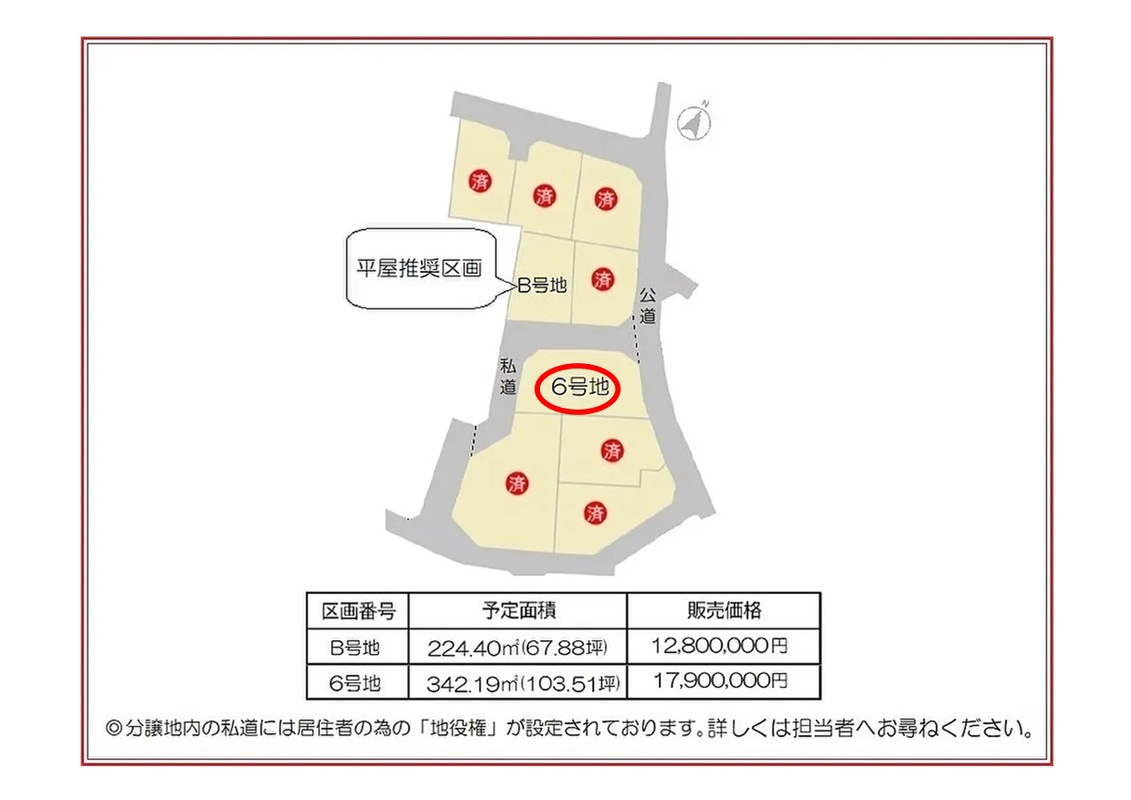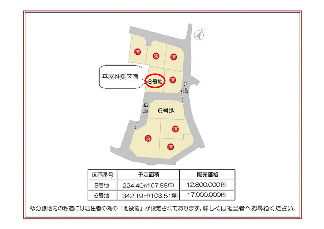 | 建築条件 | 建築条件付 建築条件付き土地とは一定期間内に、その土地に建築する建物の請負契約が締結されることを条件に販売される土地のことです。 土地売買契約締結後、建築請負会社と購入した土地に建築する建物について協議することになります。広告に参考プランが掲載されている場合でも、プランは一例であり、実際の建築プランは建築請負会社と土地購入者で協議・検討することが可能です。 期間内に建築プランが決まらず建築請負契約が成立しなければ土地売買契約は白紙となり、支払済みの金銭はすべて返還されます。 建築請負会社が指定されている場合と指定されていない場合があります。 また、建築条件付き土地の価格には、建物価格は含まれません。 |