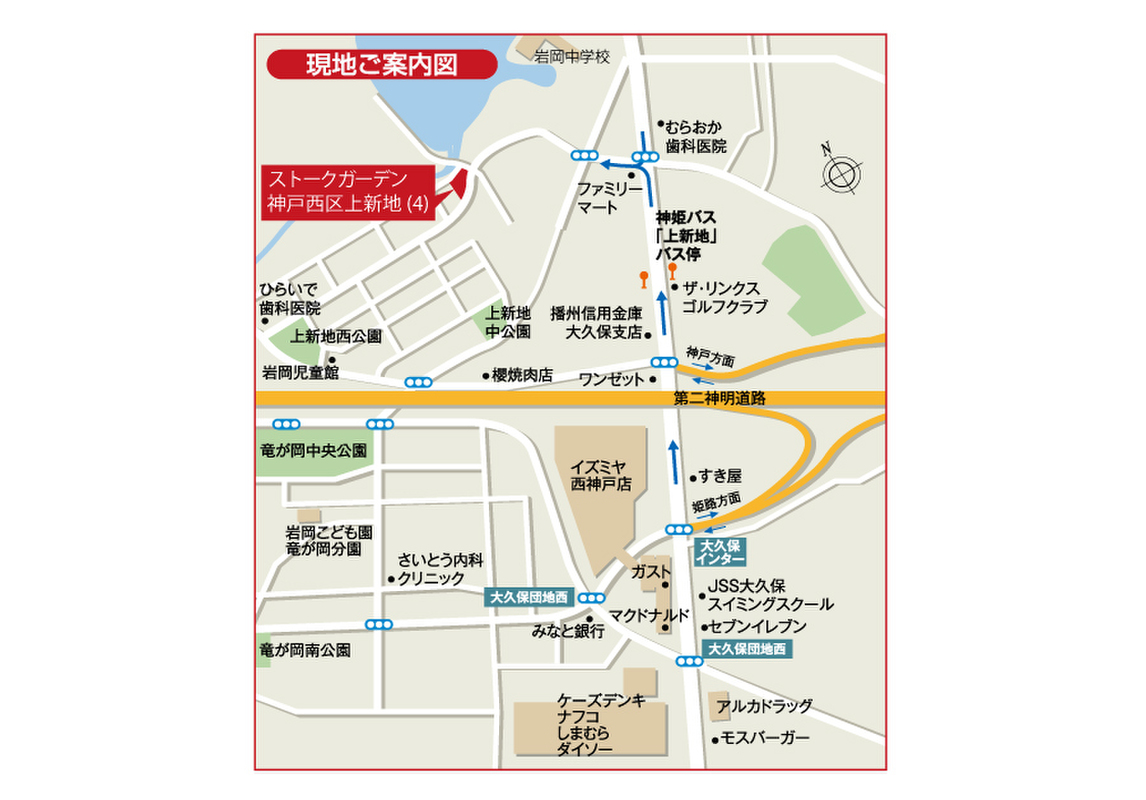 JR山陽本線「大久保」駅 バス乗車17分、神姫バス「上新地」停 徒歩5分 (370m~ 400m) |