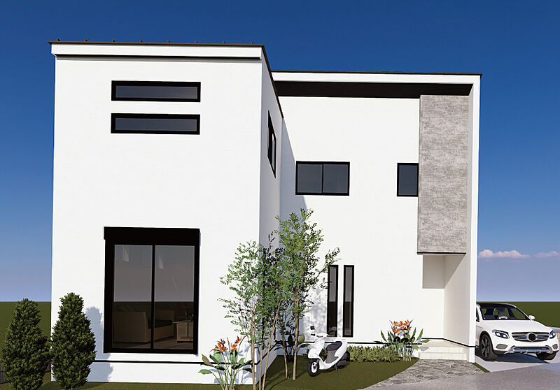 区画形状を活かし、立体感が目をひくモダンな佇まい。駐車スペースは並列2台も可能です(車種による)。外観カラーも含め、ご希望をお聞かせ下さい。