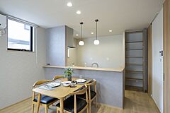 ダイニングスペースにも窓を設け、自然光がお料理をより彩りよく演出します。キッチン背面にはパントリーを備え、調理家電や食材の保管場所に。