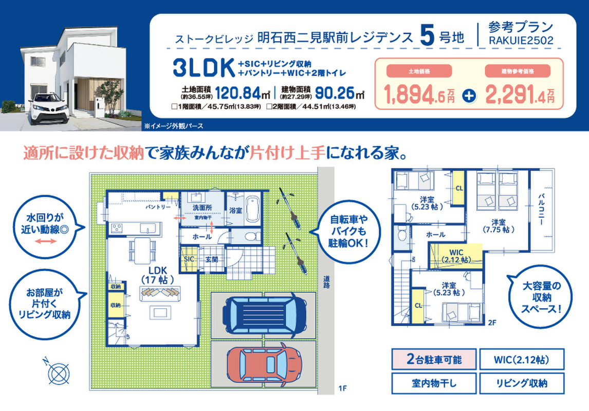間口にゆとりがあり、並列2台駐車可能!南を含む多面採光に包まれ...