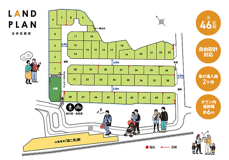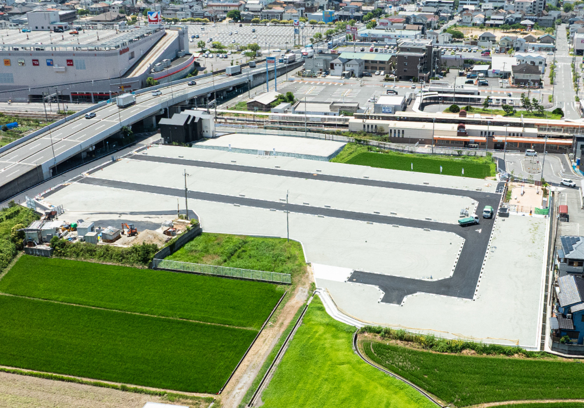 山陽電車「西二見」駅へ徒歩1分~3分!駅前エリアに全46区画の街並みが誕生!駅へ歩いてすぐのため、朝や帰りの時間を有意義にお使いいただけます。