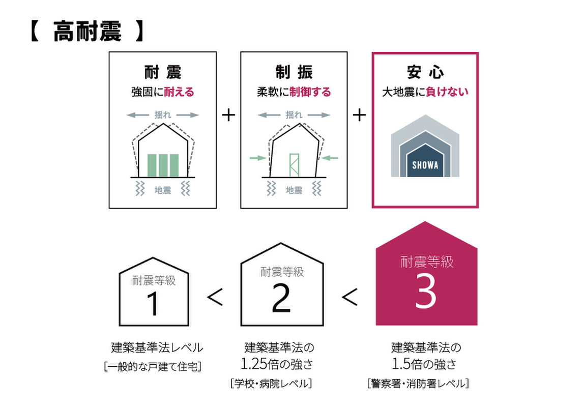 「フレームの強さ(耐震)」「揺れを吸収する能力(制震)」の相乗効果で揺れを効率よく吸収し、耐震性能は壁倍率最大3.3倍。制震性能においては、建物の変形を最大76%低減します。