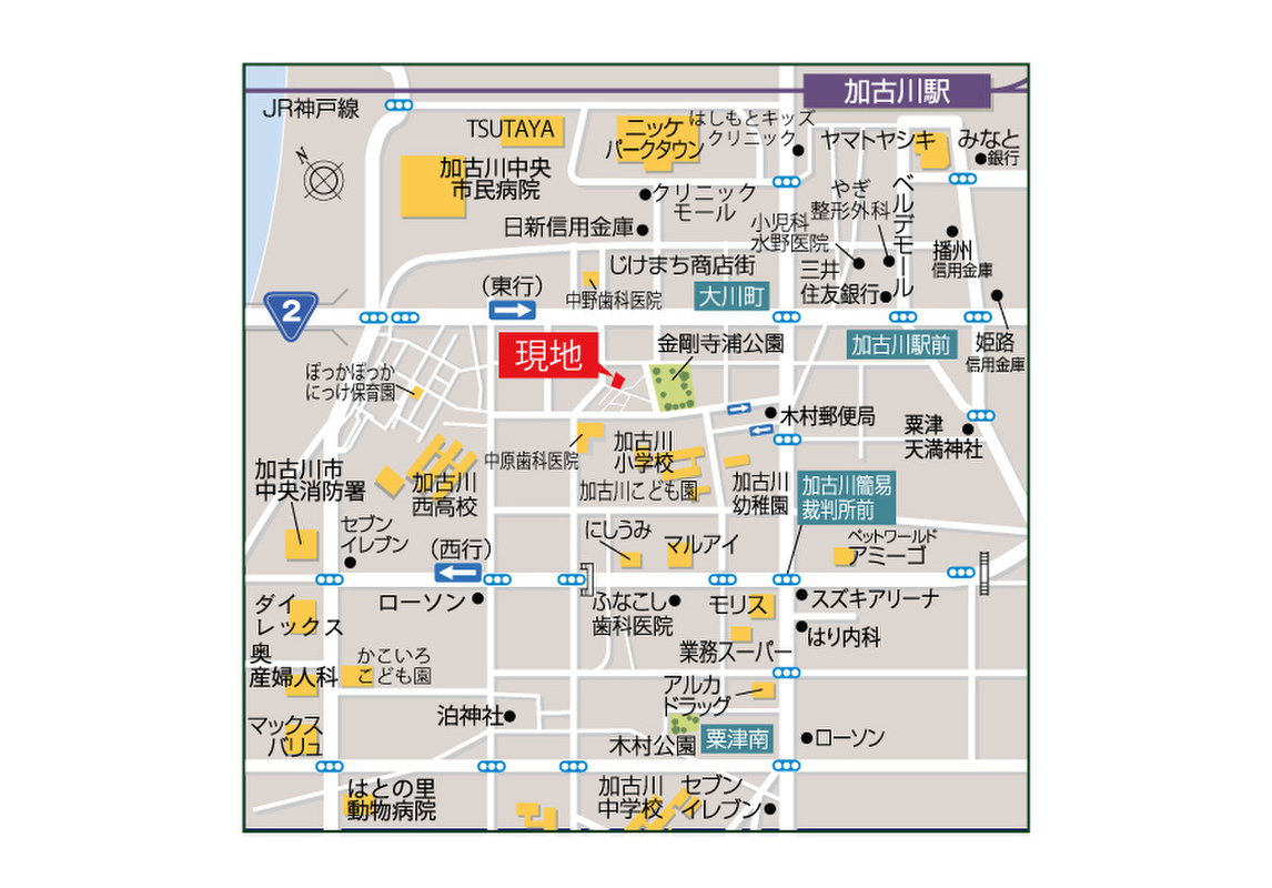 ・加古川中央市民病院など、複数の医療機関が徒歩10分圏内に揃い安心。