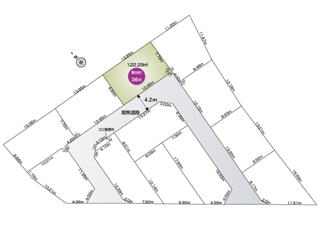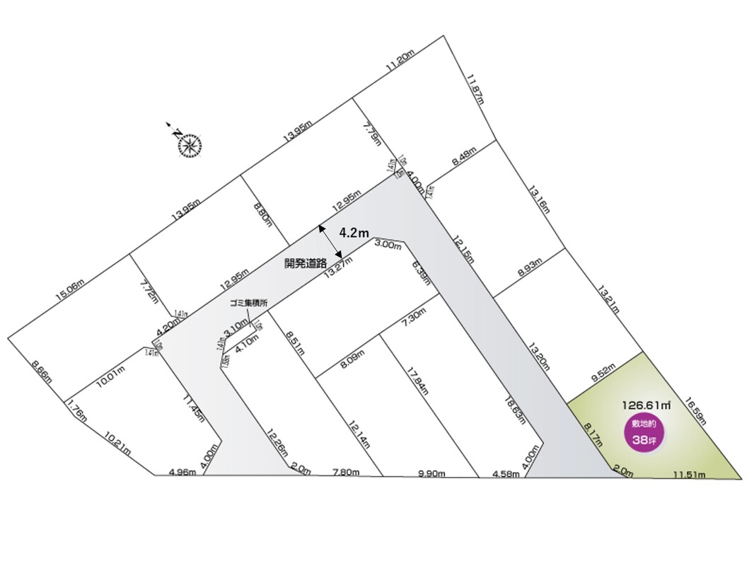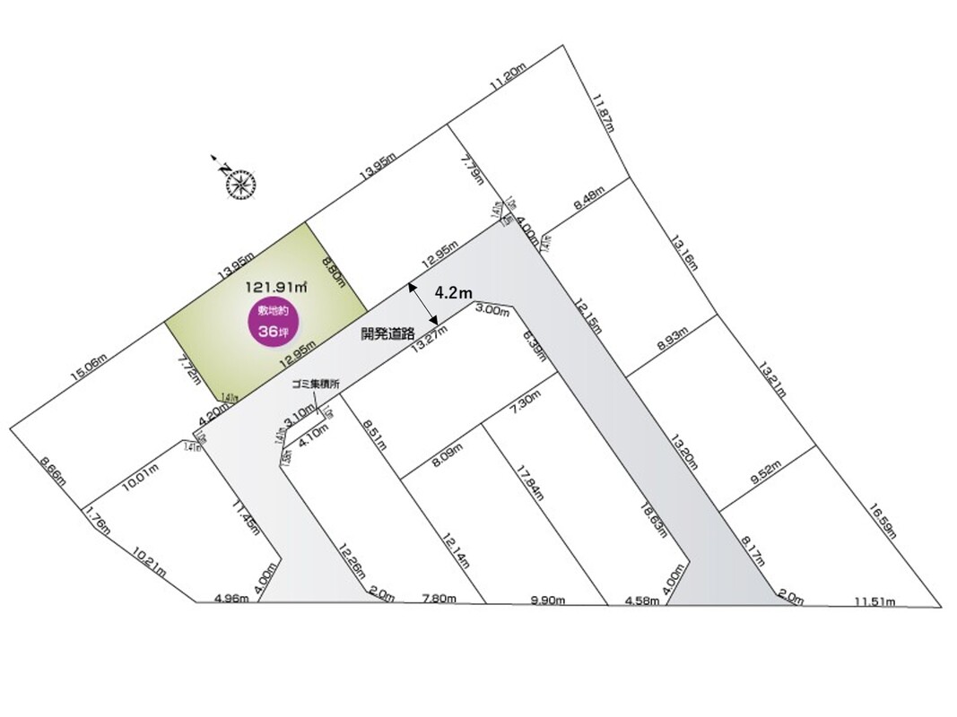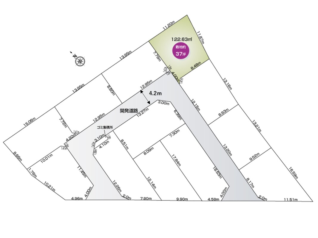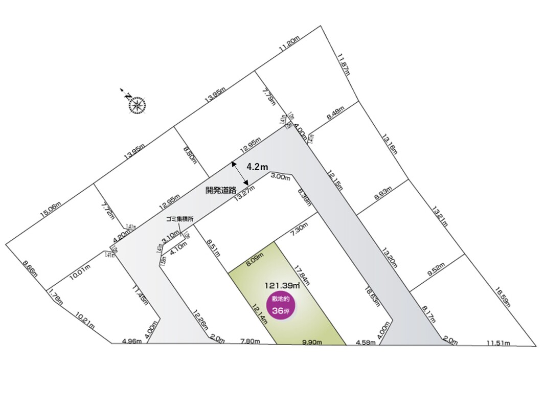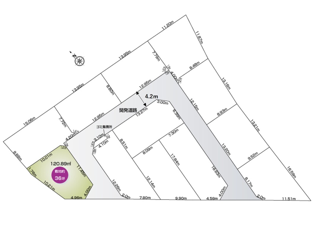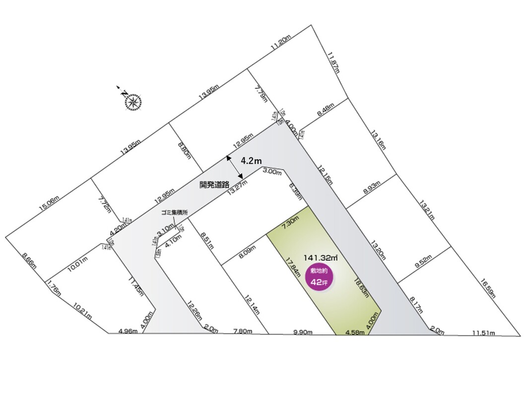 | 駐車場 | 1台 ~ 2台 | 道路の幅員 | 西側公道5.1m・開発道路4.2m |
