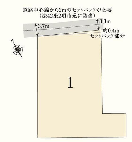 | 駐車場 | - | 道路の幅員 | 道路幅:3.3m~3.7m/道路幅の備考:北側3.3~3.7m。建築時に道路中心線から2mの道路後退(セットバック)が必要 ※法42条2項市道に該当 |