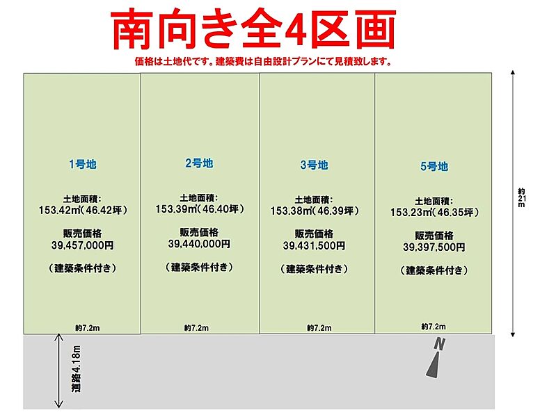 | 建築条件 | 建築条件付 建築条件付き土地とは一定期間内に、その土地に建築する建物の請負契約が締結されることを条件に販売される土地のことです。 土地売買契約締結後、建築請負会社と購入した土地に建築する建物について協議することになります。広告に参考プランが掲載されている場合でも、プランは一例であり、実際の建築プランは建築請負会社と土地購入者で協議・検討することが可能です。 期間内に建築プランが決まらず建築請負契約が成立しなければ土地売買契約は白紙となり、支払済みの金銭はすべて返還されます。 建築請負会社が指定されている場合と指定されていない場合があります。 また、建築条件付き土地の価格には、建物価格は含まれません。 |