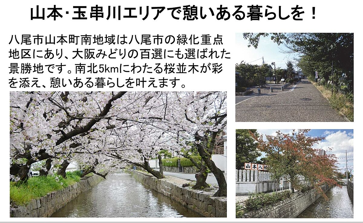 八尾市山本町南エリアは八尾市の緑化重点地区として整備され「大阪みどりの百選」に選ばれている景勝地です。付近を流れる玉串川と川沿いの桜並木は市民の憩いの場となっており、健やかな暮らせる住宅地です。