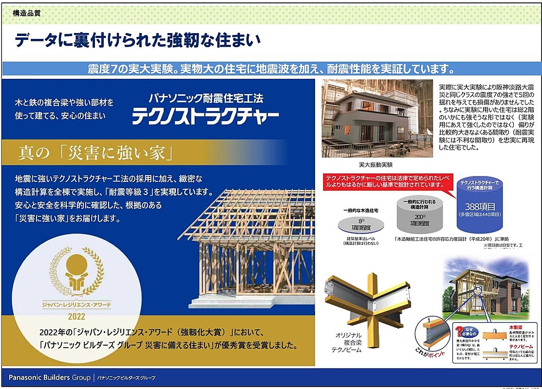 建物はパナソニック耐震住宅工法テクノストラクチャーを採用した自由設計の住まいです。普段の生活はZEH仕様で快適に、災害時には自宅が避難所になる住まいを御提案しています。