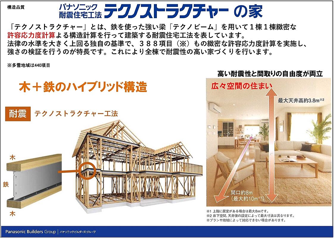 建物はパナソニック耐震住宅工法テクノストラクチャーを採用した自由設計の住まいです。普段の生活はZEH仕様で快適に、災害時には自宅が避難所になる住まいを御提案しています。
