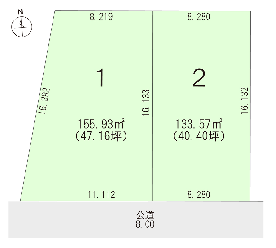 | 建物面積 | - | 土地面積 | 133.57m2(40.40坪)・155.93m2(47.16坪) |