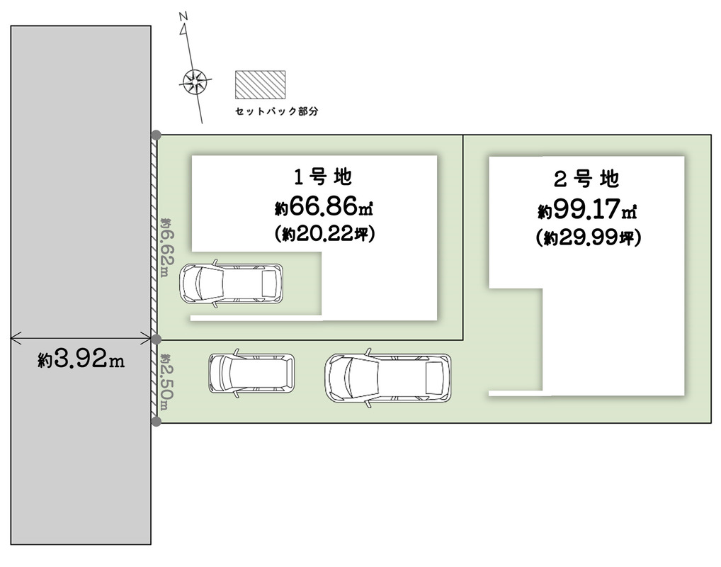 | 駐車場 | 0台 ~ 2台 | 道路の幅員 | 西側:約3.92m(幅員)/公道・私道、セットバック要 |