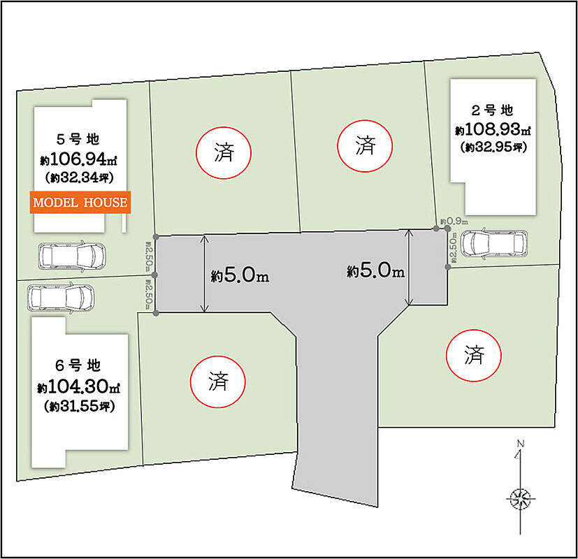 | 駐車場 | 0台 ~ 1台 | 道路の幅員 | 西側 約5.0m(幅員)/私道・東側 約5.0m(幅員)/私道 ※2号地、5号地:地役権の設定あり |
